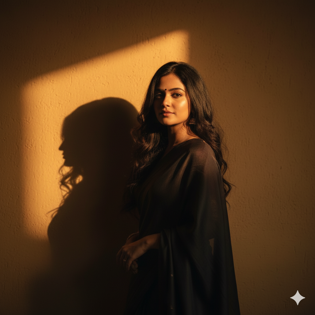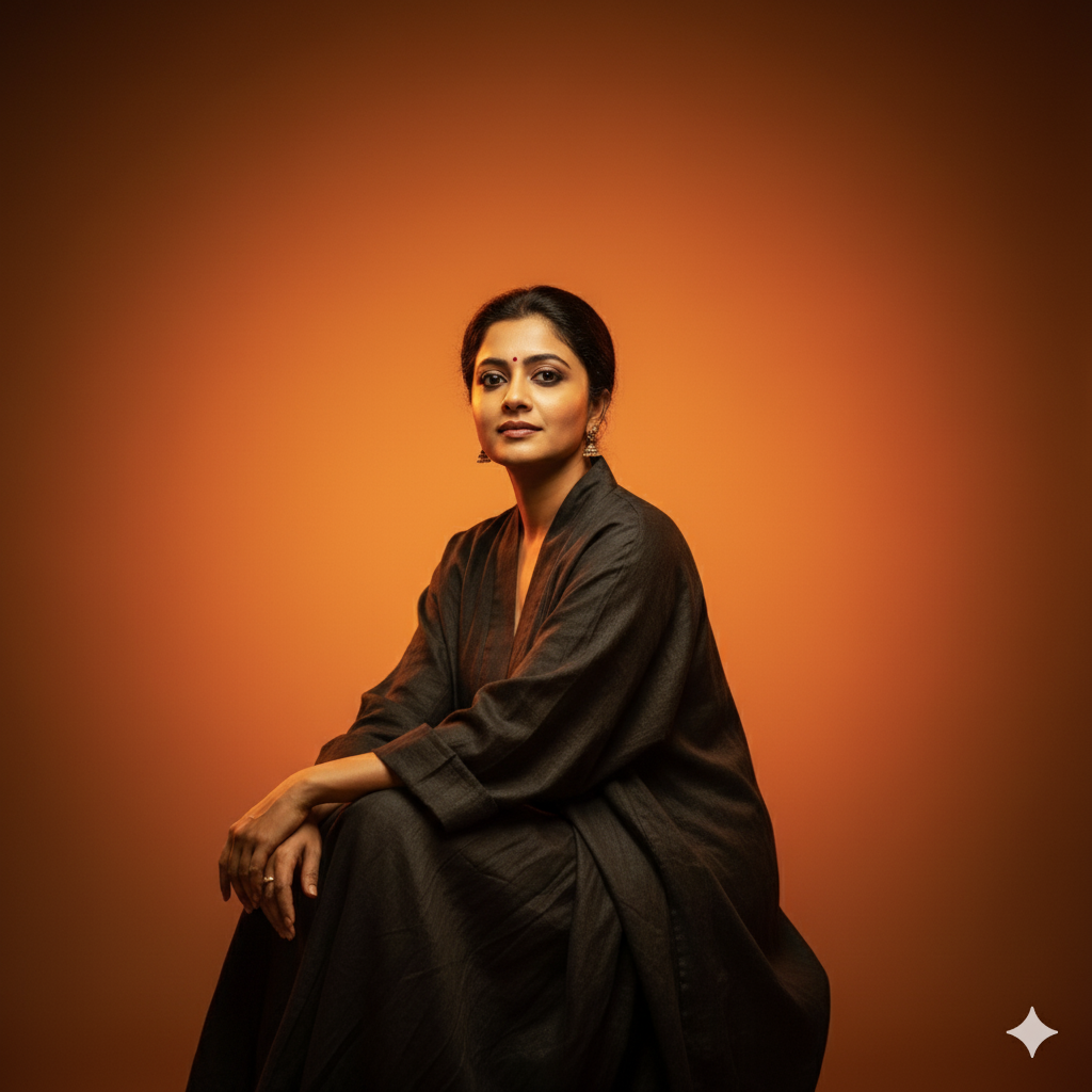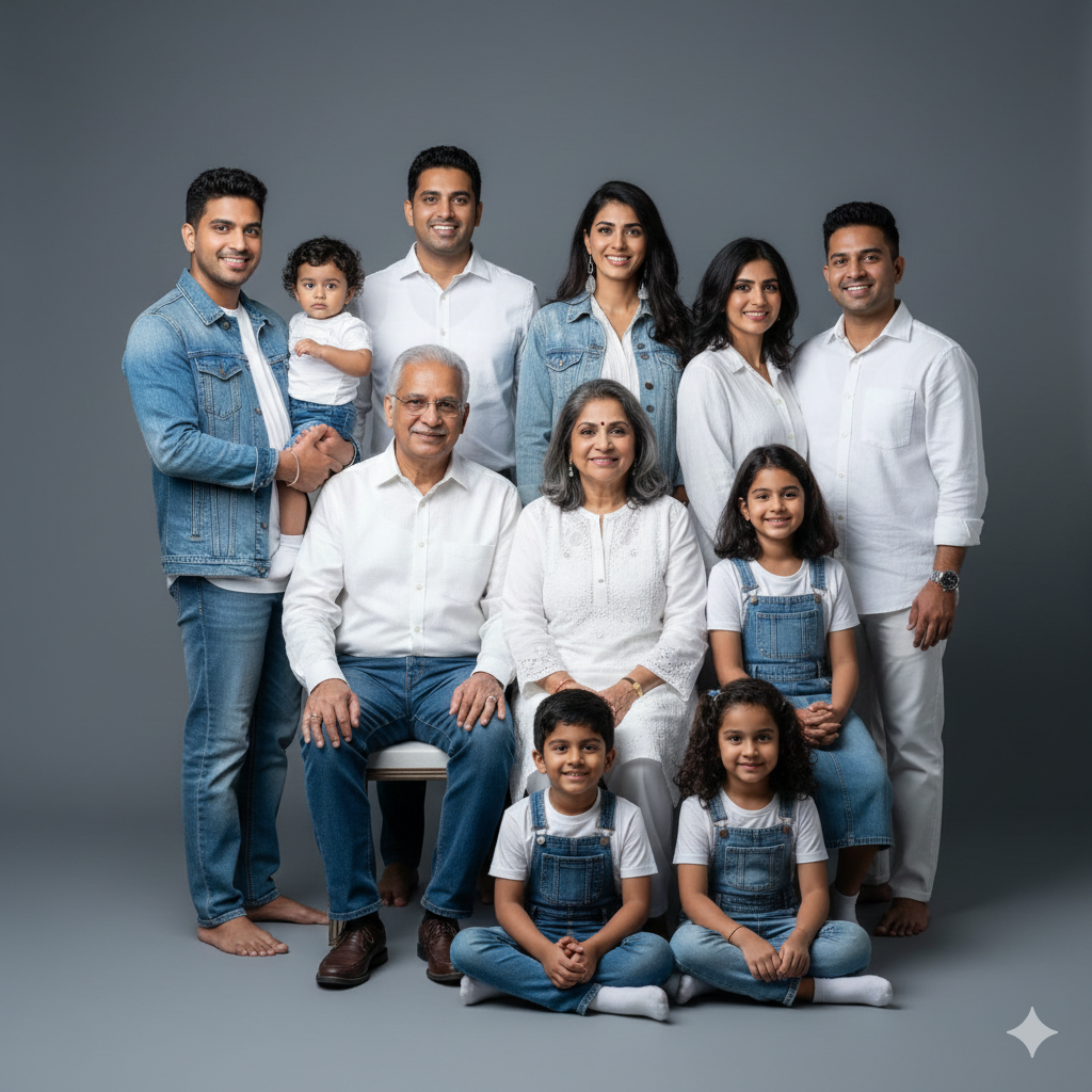 First ask user to upload an image. A cinematic, indoor portrait of an Indian father and son captured on vintage 35mm film. The scene features a soft, golden-hour glow filtering through white linen curtains, casting gentle shadows against a textured, minimalist wall. The father sits composed in a simple wooden chair while the son stands relaxed beside him. Both wear heritage-inspired linen shirts in cream and earthy tones. The aesthetic is defined by a dreamy, nostalgic haze, fine film grain, and an absolute, lifelike recreation of the subjects' facial features and expressions from the reference images.