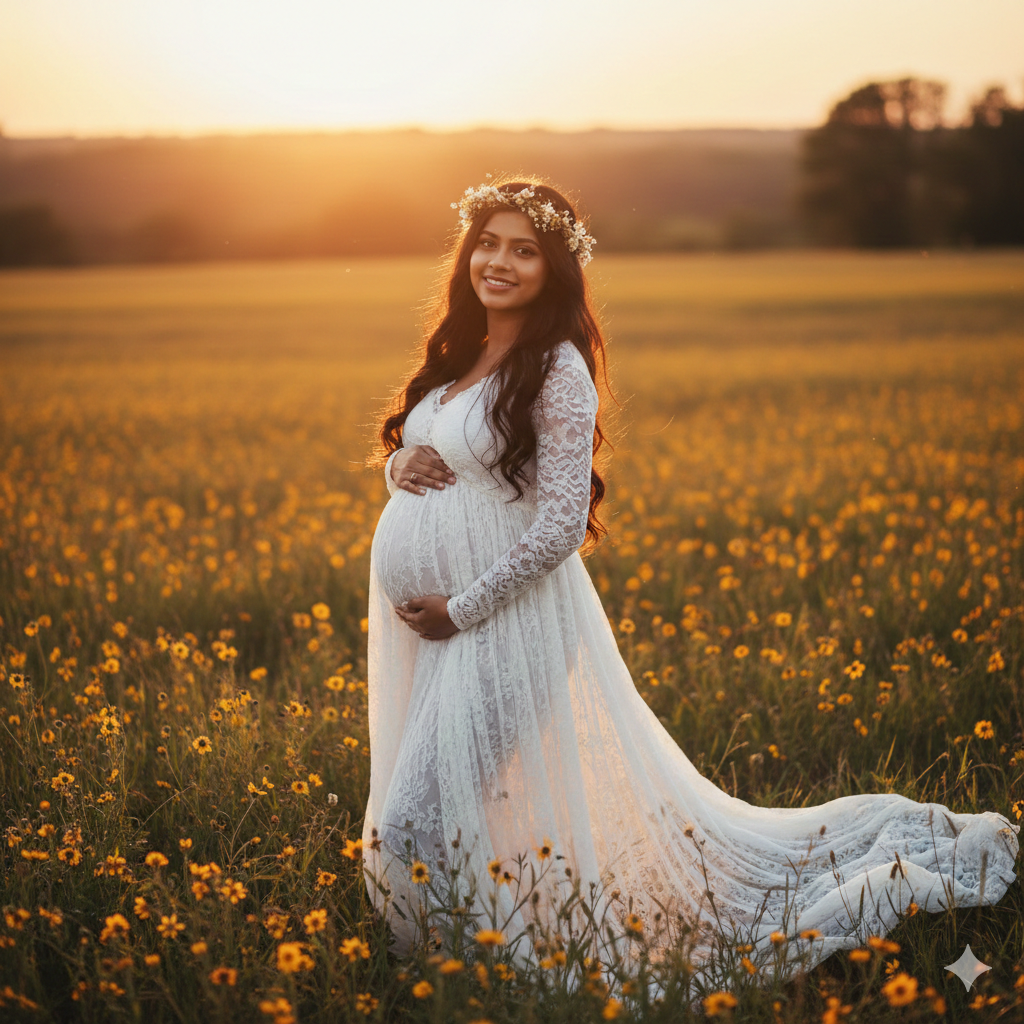 First ask user to upload a reference image. A full-body shot of a girl, with face same as reference image, with long, dark hair styled in a neat French braid. She is wearing a flowing, light pink ruffled ball gown consisting of a full-sleeved top with a square neckline and a voluminous, layered wide skirt with delicate silver embroidery at the hem. A matching sheer dupatta is draped gracefully over her shoulder. She is wearing traditional silver jhumka earrings. The fabric is a soft, delicate georgette. She is standing gracefully with her hands resting on a vintage white vanity table. The background is a soft-focus studio setting with several illuminated, glowing circular mirrors creating a warm, dreamy bokeh effect.